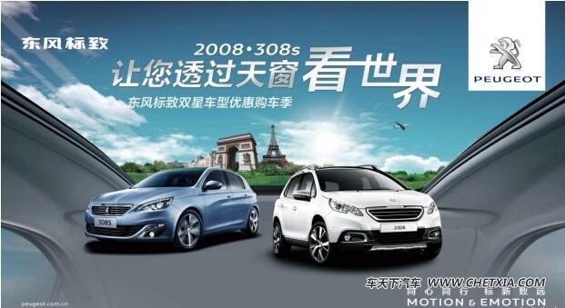 活动概述: 7月20日-8月2日,东风标致双星车型优惠购车季,男神领衔2008&308S让您透过天窗看世界!