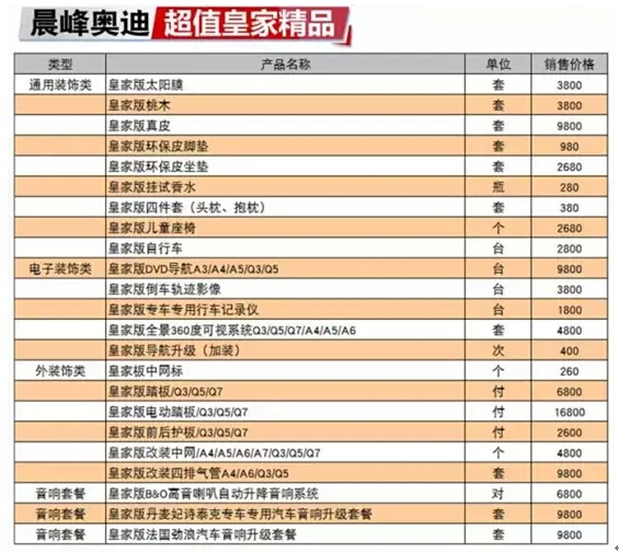 我们细化了精品市场的分析,配装了高性价比的皇家版车型,同时参与同级别车型及所有竞品对比分析,为了广大车主朋友们的福利,ta不顾所望拥有相当高的性价比!是我们的梦想、是使命的召唤、是基因的荣耀、是追逐梦想的一刻,晨峰奥迪皇家荣耀版即将为您呈现!这是一款非常有个性的ta,前进气格栅采用蜂窝式V6中网设计,两边头灯异常犀利,刀锋般尖锐地向后倾斜,发动机盖向后隆起,腰线高挺平滑,尾端为双重排气系统,尾部有个性十足扰流板,搭配大尺寸铝合金轮圈,高端大气上档次。